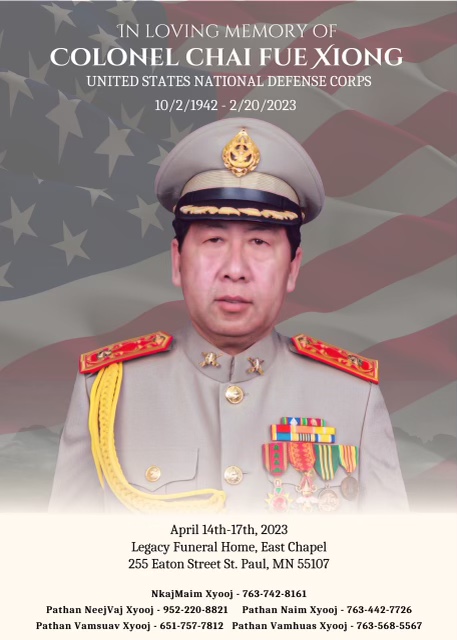 It saddens me to share with you all the passing of Colonel Chai Fue Xiong, an important Xiong leader in St. Paul, MN. The funeral service will be held as follows: